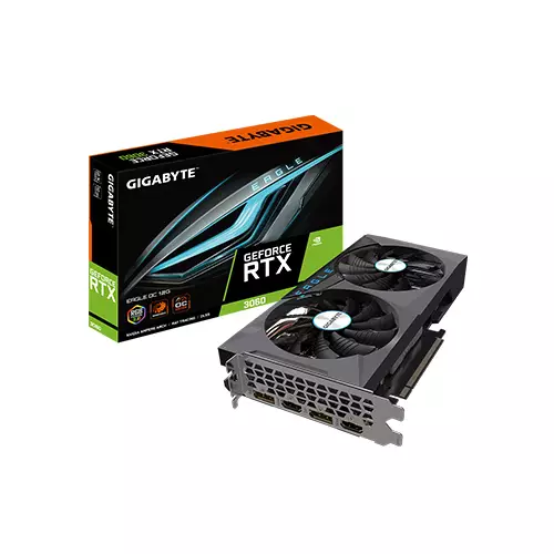 Enjoy high frame rates together with your favorite games and accelerate content creation with the Gigabyte GeForce RTX 3060 Eagle OC 12G Graphics Card. supported the Ampere architecture, Gigabyte RTX 3060 Eagle OC graphics card is meant to supply improved performance compared to its Turing-based predecessor to handle the stress of 1440p games while delivering features like real-time ray tracing, AI, and more for realistic visual effects. These technologies, driven by 3584 CUDA cores with 12GB of GDDR6 VRAM and a 192-bit memory interface, also accelerate supported photo and video editing applications additionally to enhancing live stream broadcasts and other compatible apps.The GeForce RTX 3060 Eagle OC 12G stays cool with WINDFORCE 2X technology, which incorporates two 100mm fans that spin in alternating directions to extend atmospheric pressure and help maintain optimal temperatures when games become intense. Four composite heat pipes efficiently dissipate heat from the GPU's extended heatsink while features like 3D Active Fan provide semi-passive cooling by turning the fans off when the stress is low to chop down system noise. The customizable RGB FUSION 2.0 lighting complements the aesthetic design and maybe synced with compatible peripherals for dazzling effects.
