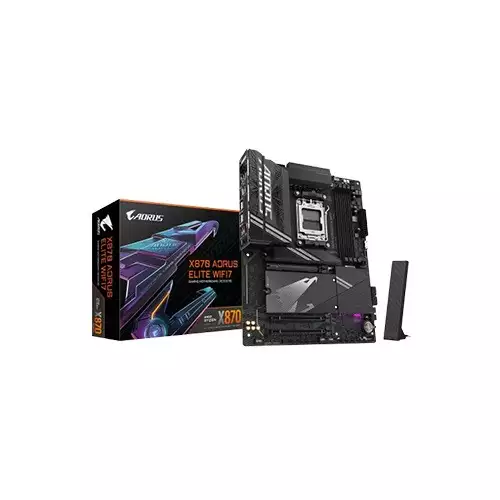 The Gigabyte X870 Aorus Elite Wifi7 motherboard is equipped with AMD's powerful Socket AM5, supporting Ryzen 9000, 8000, and 7000 Series Processors. It offers DDR5 memory support with speeds up to 8200 MHz (OC) and features 4 DIMM slots with a total capacity of up to 256 GB of RAM, ensuring exceptional multitasking and gaming performance. The motherboard includes an integrated graphics processor with AMD Radeon support, offering DisplayPort and HDMI outputs, capable of resolutions up to 3840x2160@240 Hz. Connectivity is enhanced by Realtek 2.5GbE LAN and MediaTek Wi-Fi 7, while the motherboard also supports PCIe 5.0, USB4, and multiple M.2 SSD slots for high-speed storage and expansion.