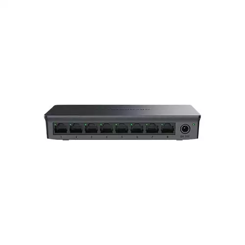 The Grandstream GWN7701 is a non-PoE unmanaged network switch equipped with 8× 10/100/1000Mbps RJ45 Gigabit ports. It adheres to multiple network standards, including IEEE 802.3i, IEEE 802.3u, IEEE 802.3ab, and IEEE 802.3x, ensuring wide compatibility and robust performance. This switch supports advanced functions such as MAC address auto-learning and auto-aging, IEEE 802.3x flow control, and 802.1p/DSCP QoS. Its data transmission capabilities are impressive, with a switching capacity of 16Gbps and support for jumbo frames up to 9KB. The device can operate within a temperature range of 0 to 40 °C and store between -20 to 60 °C, with humidity levels ranging from 10% to 90% non-condensing.