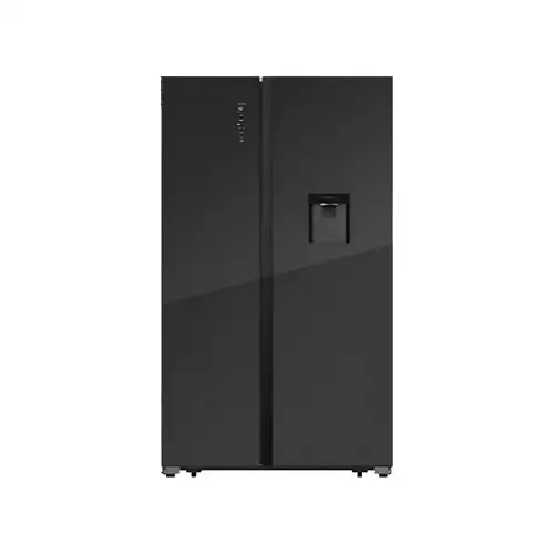 This side-by-side refrigerator features a total capacity of 580 liters, split between a 355L fridge and a 225L freezer, offering ample space for fresh and frozen food storage. It comes with an advanced inverter compressor and uses R600a refrigerant gas, known for its low environmental impact. The refrigerator is designed with a glass panel in a premium black finish, paired with a Monet Grey interior and ABS liner material for enhanced durability. Inside, you'll find front and back decor glass shelves, large door racks, a beverage tray, egg tray, ice maker, and splicing drawers—all thoughtfully designed for maximum utility. Both the fridge and freezer are equipped with ceiling-mounted LED lighting, ensuring clear visibility. The unit includes a built-in condenser, preservation light, and a water dispenser, which adds to user convenience. The appliance operates on 220–240V power and is built for N/ST climate types, suitable for the Bangladeshi climate.