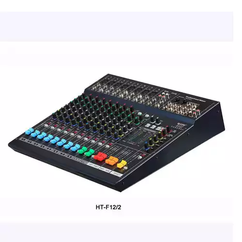 HT-F12/2: eight channels Mono and eight channels Mic input, two channel stereo input.High-performance electro-acoustic transducer Preamplifiers with Switchable Phantom Power.3-band Channel relative atomic mass and High-pass Filters.Built-in Channel Compressors.Smooth 60-millimeter Faders & lit Channel ON Switches.Bright Meters for Visual Level observance.he professional combination console is essential to an expert sound system. exploitation preamplifier because the main half, it will receive multi-channel audio signals of various impedances and levels and might equalize, mix, distribute these signals. As long as you attain the most effective SNR and quality through adjustment, the professional combination console can complete economical and quality transmission of audio signals.