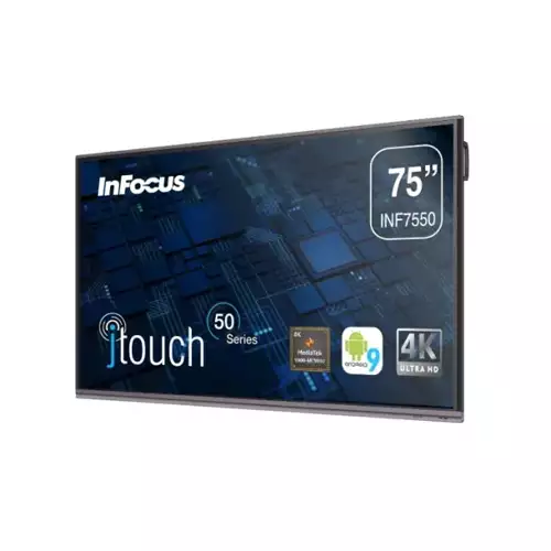 The InFocus INF7550 75" 4K Interactive Touch Display has cutting-edge technology at an affordable price. To provide a more connected and engaging collaboration experience in classrooms and meeting places. The InFocus INF7550 JTouch Screen is simple to use and brings the capacity to the room without adding complication, resulting in a proven return on your technology investment. It is easy to deploy and maintain, resulting in a cheaper total cost of ownership. It's made with 2nd generation zero bonding technology and 3mm toughened anti-glare glass. Elegant slim two-tone bezels, a hidden snap-in wireless module, magnetic pen holders, and stereo 20-watt speakers all contribute to a more important audio-visual and multi-touch experience than ever before. The MediaTek 9950 SoC with the ARM Cortex A73 Quad Core 1.8Ghz controls the InFocus INF7550 most sophisticated JTouch running Android 9. This potent combo boosts compute performance by up to 68% while delivering faultless 4K video performance.