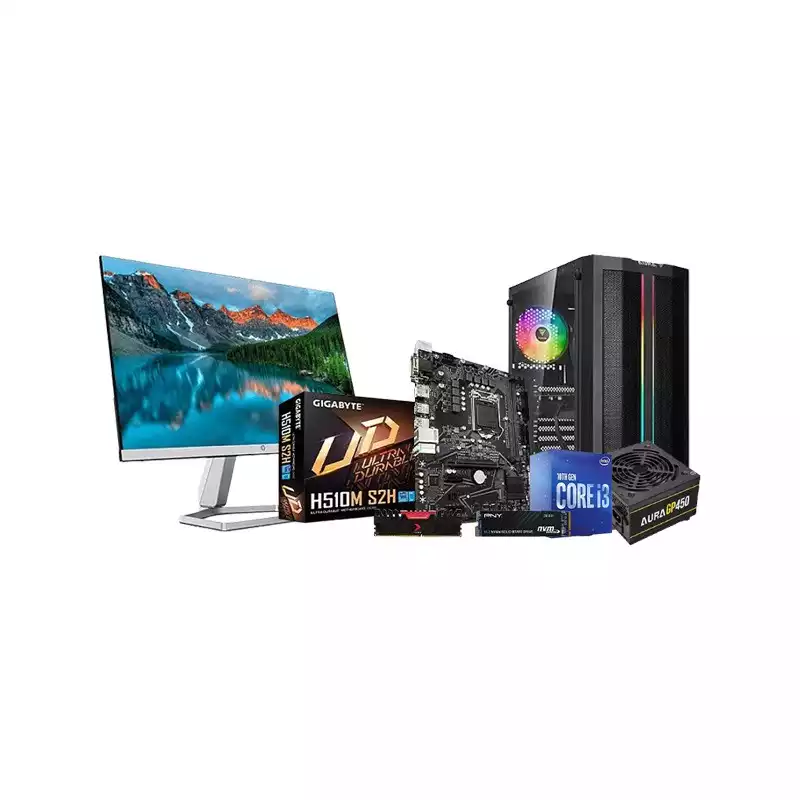 The Intel Core i3-10100 Gigabyte H510m H Motherboard 8GB RAM 256GB SSD Corporate PC with a 21.5-inch Monitor, a complete computing solution designed for corporate environments. Powered by the Intel Core i3-10100 4 Core 8 Thread 10th Gen Processor, this PC delivers reliable performance for everyday office tasks, ensuring smooth operation throughout the workday. Paired with the Gigabyte H510m H Micro ATX Motherboard, it guarantees stability and reliability, providing a solid foundation for seamless productivity. Intel Core i3-10100 Corporate PC price in bd offers excellent value for businesses seeking quality computing solutions. The PNY XLR8 Gaming 8GB DDR4 3200MHz Desktop RAM offers ample memory for multitasking and efficient workflow management, while the PNY CS1031 256GB M.2 NVMe Internal SSD provides fast data access and storage space for essential files and documents. Encased in the stylish Gamdias Aura GC3 Distinctive Mesh RGB Mid-Tower Case, this PC not only performs reliably but also adds a touch of sophistication to any office environment with its distinctive RGB lighting. The Gamdias Aura GP450 450W Power Supply ensures efficient and consistent power delivery, supporting stable performance under various workloads. Additionally, the included HP M22f 21.5-inch 75Hz AMD Free Sync Full HD IPS Monitor enhances productivity with its crisp visuals and smooth display. Whether for document processing, web browsing, or light multitasking, the Intel Core i3-10100 Gigabyte H510m H Motherboard 8GB RAM 256GB SSD Corporate PC with 21.5-inch Monitor offers a dependable and comprehensive computing solution for corporate users.