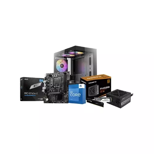 This high-performance desktop is powered by the Intel Core i5 13400 13th Gen Raptor Lake processor, which comes with enhanced cores and threads to handle even the most demanding tasks effortlessly. The MSI PRO B760M-E DDR5 motherboard supports advanced features, including DDR5 memory for faster data transfer rates and future-proof compatibility with 14th Gen processors. Equipped with 16GB Kingston Fury Beast DDR5 6000MHz RAM, this system is designed to provide fast, reliable performance for gaming, content creation, and multitasking. The Kimtigo TP3000 1000GB Gen3 M.2 NVMe SSD ensures speedy boot times and quick access to data and applications. To power it all, the Gigabyte P450B 450W 80 Plus Bronze Certified Power Supply ensures efficiency and stable power delivery, while the Antec CX200M RGB Elite Mid Tower case offers durability and aesthetic appeal, with its RGB lighting and tempered glass panels.