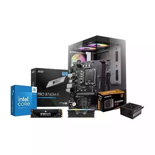 At the heart of this setup is the Intel Core i5 13400 13th Gen Raptor Lake Processor, delivering powerful multitasking capabilities with its hybrid core architecture. The system is built on the MSI PRO B760M-E DDR5 motherboard, ensuring compatibility with 14th Gen processors and featuring advanced technologies like DDR5 support and robust connectivity.desktop is equipped with Corsair VENGEANCE RGB 16GB DDR5 RAM, operating at an ultra-fast 6000MHz, which ensures smooth multitasking and rapid data access. For storage, it features a Corsair MP600 ELITE 1TB PCIe Gen4 NVMe SSD, offering lightning-fast read and write speeds while also including a heatsink for optimal thermal performance.Powering the system is the reliable Gigabyte P450B 450W 80 Plus Bronze Certified Power Supply, providing stable and efficient power delivery. The setup is housed in the Antec CX200M RGB ELITE Mid Tower Case, which features an RGB-lit tempered glass panel, blending aesthetics with practicality.