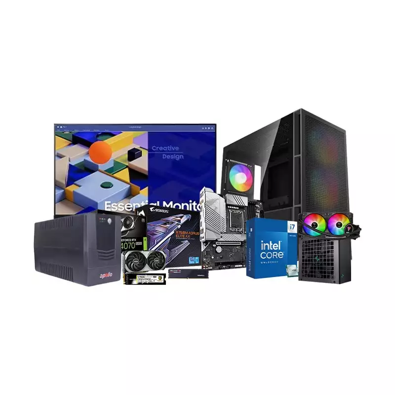 The Intel Core I7 14700k Desktop PC price in BD is reflective of its unparalleled performance and innovative design. This all-new Desktop PC features cutting-edge components meticulously crafted to elevate your computing experience to new heights. At its heart lies the Intel Core i7 14700K, a 14th-generation processor boasting an incredible 20 cores and 28 threads, delivering unparalleled multitasking capabilities and raw processing power for even the most demanding tasks. Paired with the Gigabyte B760M Aorus Elite AX motherboard, this system ensures seamless connectivity and uncompromising reliability. Its Micro ATX form factor provides the perfect balance between compactness and expandability, making it ideal for various setups. Experience unparalleled visual fidelity and gaming prowess with the MSI GeForce RTX 4070 Super 12G Ventus 2X OC graphics card. Equipped with advanced features and unmatched performance, it delivers smooth frame rates and stunning graphics for an immersive gaming experience like never before. Keeping temperatures in check is the Gamdias Aura GL240 all-in-one RGB liquid cooler, ensuring optimal thermal management even during intense gaming sessions or heavy workloads. With its striking RGB lighting effects, it not only cools your system but also adds a touch of style to your setup. Experience lightning-fast responsiveness and multitasking prowess with the G.Skill Ripjaws $5 16GB 6000MHz DDR5 desktop RAM, providing ample memory for smooth performance across various applications and tasks. Store your games, files, and multimedia content with blazing-fast speeds on the AITC Kingsman K2 KP800 1TB SSD, offering ample storage capacity and rapid data access for a seamless computing experience. Powering this beast is the Deepcool DQ750M-V3L full modular 750W 80 Plus Gold power supply, delivering reliable and efficient power delivery to all components while maintaining stability and energy efficiency. Housed in the sleek and stylish Deepcool CH560 Digital Mid Tower Micro-ATX casing, this system not only offers ample space for your components but also features customizable RGB lighting for a personalized touch to your setup. Complete your immersive computing experience with the Samsung LS22C310EAE 22-inch IPS 75Hz essential monitor, delivering vibrant colors and smooth visuals for an enhanced viewing experience. Ensure uninterrupted operation and protect your system from unexpected power outages with the Apollo 1120F 1200VA UPS, providing reliable backup power to keep your system running smoothly at all times. With its unrivaled performance, innovative features, and stunning aesthetics, the Desktop PC redefines what's possible in the world of computing, empowering you to unleash your creativity and conquer any task with ease.Purchase your Intel Core I7 14700k Gigabyte B760m Aorus Motherboard 16GB RAM 1TB SSD Desktop PC with Rtx 4070 Graphics from Tech Land BD.