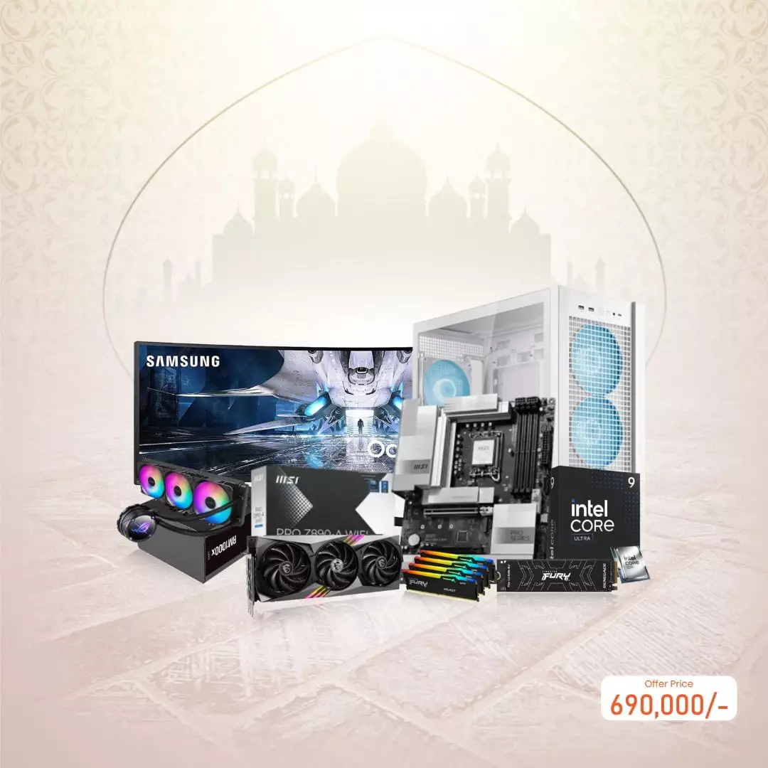 desktop PC is powered by the cutting-edge Intel Core Ultra 9-285K Arrow Lake Processor, a high-performance 16-core, 24-thread CPU that delivers exceptional computing power, whether you're gaming or running demanding applications. Paired with the MSI PRO Z890-A WIFI LGA 1851 ATX DDR5 Motherboard, the system supports fast connectivity, PCIe 5.0, and DDR5 memory for enhanced data throughput. The MSI GeForce RTX 4090 GAMING X TRIO 24G GPU, with its powerful GDDR6X memory, is capable of handling 4K gaming, ray tracing, and VR at ultra-settings, making it an ideal choice for immersive gaming experiences and professional creative workflows. For cooling, the ASUS ROG STRIX LC II 360 ARGB 360mm All in One Liquid CPU Cooler ensures that the CPU remains at optimal temperatures under heavy load, allowing for sustained peak performance. The system features 64GB Kingston FURY BEAST DDR5 6000MHz RGB RAM, ensuring lightning-fast data processing and smooth multitasking. For storage, the Kingston FURY Renegade 2TB PCIe 4.0 NVMe M.2 Internal SSD provides lightning-fast read/write speeds, ensuring quick boot times and seamless operation. Powering this powerhouse is the CORSAIR RM1000X SHIFT 1000W 80 PLUS GOLD Fully Modular ATX Power Supply, which delivers efficient and stable power. The build is housed in the ASUS TUF Gaming GT302 ARGB Aura Sync Mid Tower Gaming Case, designed for excellent airflow and customizable RGB lighting. For stunning visuals, the system comes with the Samsung Odyssey G9 49-inch 32:9 240Hz Curved HDR NVIDIA G-SYNC QLED Gaming Monitor, offering ultra-wide immersion, stunning visuals, and a 240Hz refresh rate for smooth gameplay.