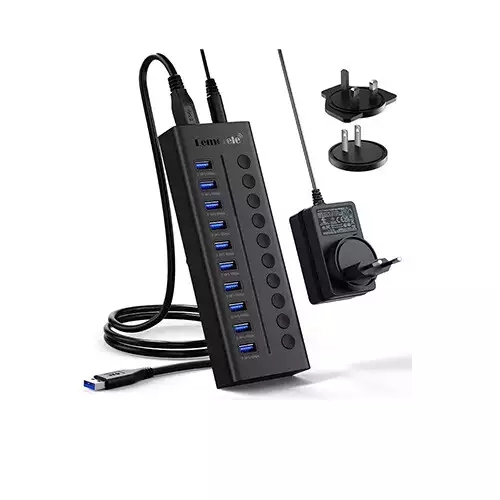 Lemorele TC119 10-in-1 USB 3.0 Hub with Powered Adapter is a powerful solution for expanding your device connectivity. It converts a single USB port into ten high-speed USB 3.0 ports. This hub is ideal for home, office, and gaming setups. Each port supports fast data transfer up to 5 Gbps. You can connect external hard drives, flash drives, keyboards, mice, printers, cameras, and more. The hub allows simultaneous device use without slowing your computer. The TC119 comes with a dedicated 12 V 2 A power adapter. This ensures stable performance even when all ten ports are in use. The powered design also allows you to charge multiple devices simultaneously. Smartphones, tablets, headphones, and other USB-powered accessories can charge quickly while you transfer data.