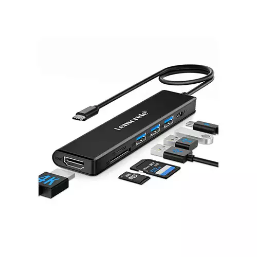 LEMORELE TC70 7-in-1 USB-C Hub is a compact, powerful solution for expanding the connectivity of modern laptops, tablets, and smartphones. It transforms a single USB-C port into multiple essential connections, making everyday work and entertainment more convenient. The hub includes an HDMI port that supports up to 4K resolution at 30Hz, allowing you to connect your device to a monitor, TV, or projector for clear, smooth visuals. For data transfer and peripherals, the hub features one USB-A 3.0 port that delivers up to 5Gbps, along with two USB-A 2.0 ports for devices like keyboards, mice, printers, and external drives. It also includes SD and TF card slots, enabling quick access to photos, videos, and files from cameras, drones, and memory cards. These slots support efficient file transfers, helping streamline your workflow. The USB-C Power Delivery port supports up to 100W charging, so you can keep your device powered while using all other ports simultaneously. This feature is especially useful for long work sessions, travel, and presentations. The hub supports a wide range of USB-C devices with video output, including laptops, tablets, and some smartphones. The LEMORELE TC70 features a lightweight, durable design, making it easy to carry in a bag or pocket. Its plug-and-play setup requires no drivers or software. Just connect and start using it instantly. Whether you work from home, attend meetings, study, or travel, this hub helps you stay productive and organized. It offers reliable performance, strong compatibility, and a clean design, making it a smart choice for anyone who needs more ports from a single USB-C connection.