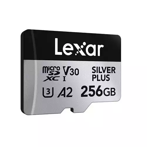 The Lexar 256 GB Professional SILVER PLUS UHS‑I microSDXC Memory Card is a high-performance storage solution designed for reliable and fast data transfer. With 256 GB capacity, it provides ample space for photos, videos, apps, and large files. Featuring the UHS‑I interface and V30, U3, Class 10, A2 ratings, it delivers read speeds up to 205 MB/s and write speeds up to 150 MB/s, ensuring smooth capture of Full HD and 4K video.