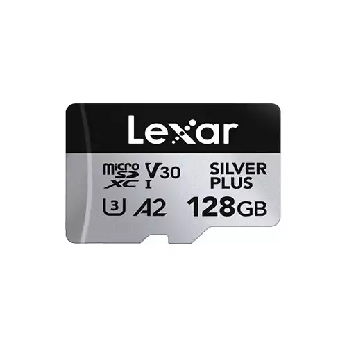 The Lexar Professional SILVER PLUS UHS‑I microSDXC Memory Card is a high-performance storage solution designed for reliable and fast data transfer. With 128 GB capacity, it provides ample space for photos, videos, apps, and large files. Featuring the UHS‑I interface and V30, U3, Class 10, A2 ratings, it delivers read speeds up to 205 MB/s and write speeds up to 150 MB/s, ensuring smooth capture of Full HD and 4K video.