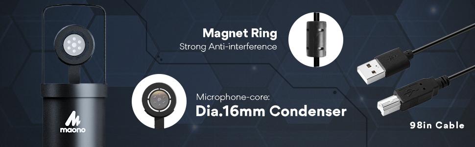With the 16mm electret condenser transducer, the MAONO AU-A04H Microphone can give you a strong bass response. MAONO AU-A04H professional condenser microphone picks up crystal clear audio. The magnet ring, on the USB microphone cable, has a strong anti-interference function, which makes you have a better feel