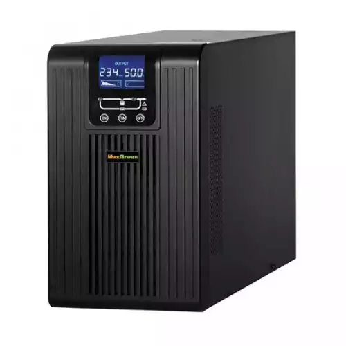To provide equipment with excellent technical features, the MaxGreen UPS series uses active input PFC rectifiers (Power Factor Correctors) and the benefits of PWM technology with IGBT. Most of the time, they fix issues with the mains energy without using the battery, extending its useful life. They are perfect for delivering 3kVA or less essential systems that need a high-reliability, high-quality supply with affordable operation and maintenance. Data is sent locally via an LCD display and LED mimic panel. Users may check the unit's status and acquire information about its surroundings thanks to the communications interface and robust software. Two Years Warranty (1 Year Battery + 2 Years Service) is included with this best-in-class security and manageability in a space-saving design.