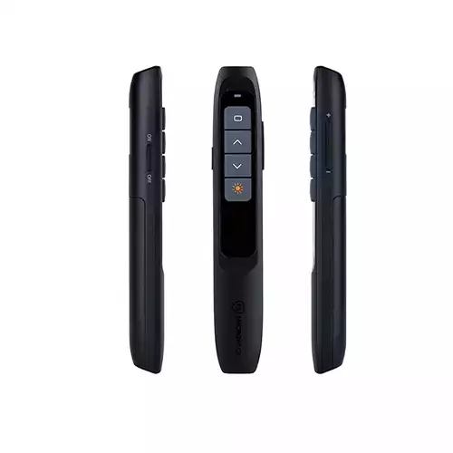 The Wireless Presenter with Laser Pointer is a sophisticated device with advanced features to help deliver professional presentations. It features long range wireless technology, storable USB receiver for convenience and portability, mouse feature, complete slideshow control and laser pointer to highlight key-points. The features that are included here are 2.4 GHz technology for reliable wireless freedom and remote control up to 100M away, Storable ultra-slim wireless receive Integrated ultra–bright red laser pointer to highlight and the presentation’s key points Omni-direction wireless technology.