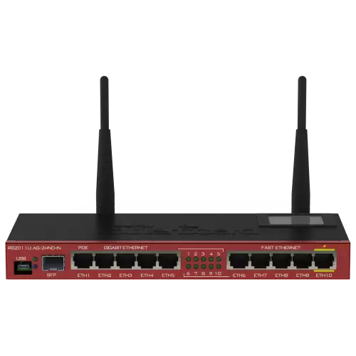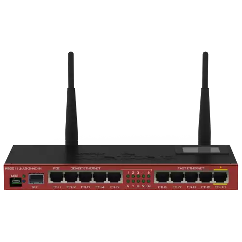 The RB2011Ui is a low cost multi port device series. Designed for indoor use, and available in many different cases, with a multitude of options.The RB2011 is powered by RouterOS, a fully featured routing operating system which has been continuously improved for fifteen years. Dynamic routing, hotspot, firewall, MPLS, VPN, advanced quality of service, load balancing and bonding, real-time configuration and monitoring - just a few of the vast number of features supported by RouterOS.RouterBOARD 2011UiAS-2HnD has most features and interfaces from all our Wireless routers. It’s powered by the new Atheros 600MHz 74K MIPS network processor, has 128MB RAM, five Gigabit LAN ports, five Fast Ethernet LAN ports and SFP cage (SFP module not included!). Also, it features powerful dual chain 2.4Ghz (2312-2732MHz depending on country regulations) 802.11bgn wireless AP, RJ45 serial port, USB port and RouterOS L5 license, as well as desktop case with power supply, two 4dBi Omni antennas and LCD panel- all this for only $129!Tested and recommended to use with MikroTik SFP modules: S-85DLC05D, S-31DLC20D and S-35/53LC20D (not included)RouterBOARD 2011UAS-2HnD-IN comes with desktop enclosure, LCD panel and power supply.Wall mount kit (product code RBWMK) for network closet is available for purchase as an optional accessory.The RB2011Ui also has passive PoE output capability on the last port (ETH10), this means you can power another device just by connecting it over regular Ethernet cable.