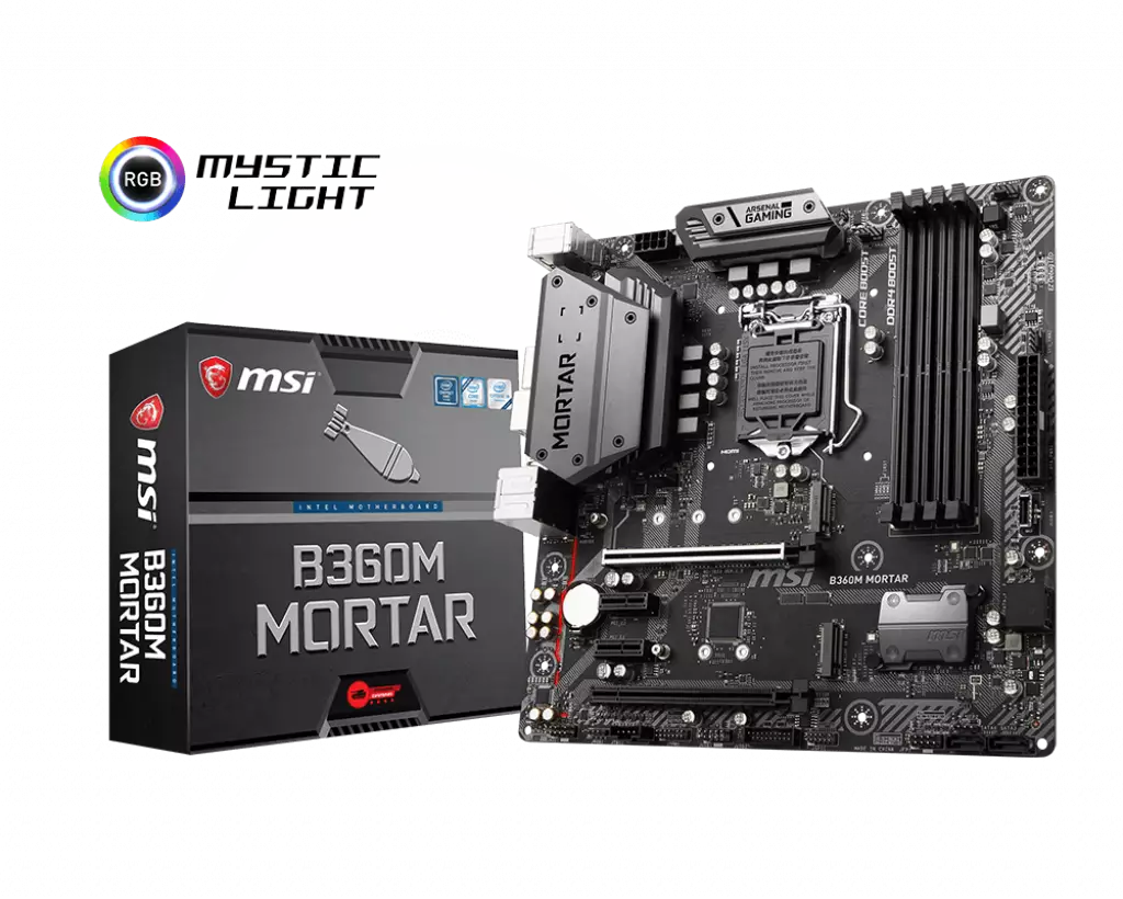 The B360M Mortar LGA 1151 Micro-ATX Motherboard from MSI is built on the Intel B360 chipset and has an LGA 1151 socket designed for 8th generation Intel Core, Pentium Gold, and Celeron processors. It's equipped with four DDR4 memory slots that support up to 64GB of 2666 MHz RAM. For storage, it has four SATA III ports and a two M.2 slots, which also supports Intel Optane Memory. As a gaming-focused board, the B360M Mortar has two PCIe 3.0 x 16 slots, ideal for graphics cards, and two PCIe 3.0 x 1 slots for other PCIe-based hardware. Other integrated features include Intel Gigabit LAN, HDMI, DVI-D, and DisplayPort outputs, and Realtek ALC892 7.1-channel high-definition audio. Moreover, this motherboard is equipped with RGB lighting that you can customize using MSI's downloadable software.