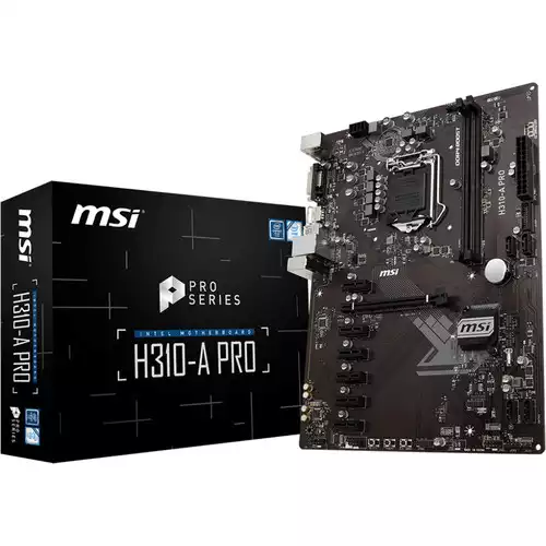 The H310-A Pro LGA 1151 ATX Motherboard from MSI is a crypto currency mining-focused motherboard designed with a total of seven PCIe slots. It's built on the Intel H310 chipset with a LGA 1151 socket for 8th generation Intel Core, Pentium Gold, and Celeron processors. There are two DDR4 memory slots that support a max of 32GB of 2666 MHz RAM and four SATA III ports for storage drives. Other integrated features include Intel Gigabit LAN, DVI-D and HDMI outputs, and Realtek ALC887 7.1-channel high-definition audio.