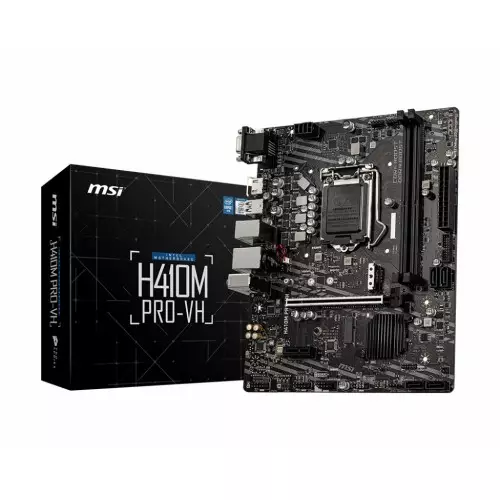 The MSI H410M PRO-VH Motherboard From Msi. This MSI H410M PRO-VH Motherboard helps you to work smarter by delivering an efficient and productive experience, it featuring stable functionality and high-quality assembly, MSI H410M PRO-VH Motherboard provide not only optimized professional workflows but also less troubleshooting and longevity. The MSI H410M PRO-VH Motherboard let you manage speeds and temperatures for all your system and CPU fans. Total Fan Control allows you check your primary system characteristics in a simplified graphical interface. You can also set up to 4 temperature targets for CPU and motherboard, which will adjust the fan speeds automatically. MSI H410M PRO-VH Motherboard supports 10th Gen Intel Core / Pentium Celeron processors for LGA 1200 socket, DDR4 Memory, up to 2933(Max) MHz. This MSI H410M PRO-VH Motherboard featured with premium layout and digital power design to support more cores and provide better performance, Advanced technology to deliver pure data signals for the best performance and stability. MSI H410M PRO-VH Motherboard helps users work smarter by delivering an efficient and productive experience. Featuring stable functionality and high-quality assembly, MSI H410M PRO-VH Motherboard provide not only optimized professional workflows but also less troubleshooting and longevity.