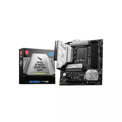 MSI MAG B760M MORTAR WIFI DDR5 12th/13th gen Motherboard. The MSI PRO B760M-A WIFI DDR4 12th/13th Gen Motherboard is an advanced motherboard that supports 12th/13th Gen Intel® Core™ processors, Pentium® Gold, and Celeron® processors. It features an Intel B760 chipset and an LGA1700 CPU socket. The motherboard supports a maximum memory capacity of 192GB through its 4x DDR5 memory slots with a memory support of 7000+(OC)/ 6800(OC)/ 6600(OC)/ 6400(OC)/ 6200(OC)/ 6000(OC)/ 5800(OC)/ 5600(JEDEC)/ 5400(JEDEC)/ 5200(JEDEC)/ 5000(JEDEC)/ 4800(JEDEC) MHz. The onboard graphics of the MSI PRO B760M-A WIFI DDR4 12th/13th Gen Motherboard includes 1x HDMI™ and 1x DisplayPort that support up to 4K 60Hz resolution. The motherboard also features 2x PCI-E x16 slots, 1x PCI-E x1 slot, 2x M.2 slots, and 4x SATA 6G storage options. In terms of connectivity, the motherboard has 4x USB 2.0 (rear), 4x USB 2.0 (front), 2x USB 3.2 Gen1 Type-A (front), 3x USB 3.2 Gen2 Type-A (rear), 1x USB 3.2 Gen2 Type-C (front), and 1x USB 3.2 Gen2x2 Type-C (rear). It also features Realtek® 2.5Gbps LAN and Intel® Wi-Fi 6E with MU-MIMO TX/RX, 2.4GHz / 5GHz / 6GHz* (160MHz) up to 2.4Gbps and Bluetooth® 5.3 support.