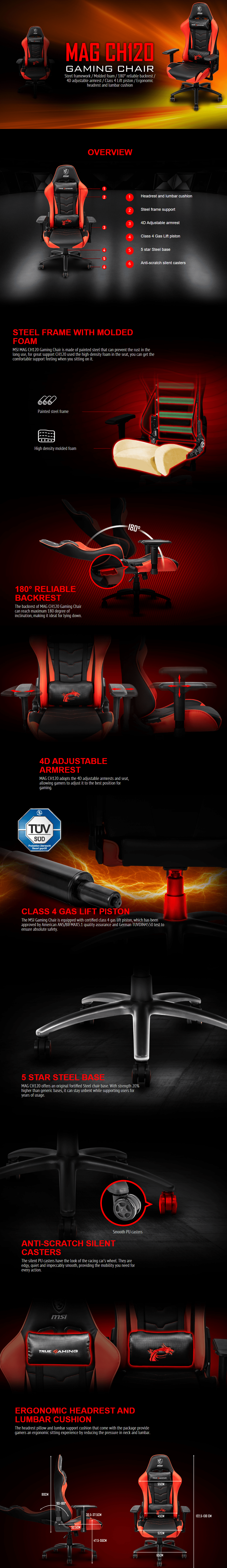 The MSI MAG CH120 Gaming Chair from MSI is a sturdy, comfortable, and adjustable chair designed for gamers. It features height adjustments, a 180° recline, adjustable tilt, and customizable armrests. Moreover, The MSI MAG CH120 Gaming Chair made with a full steel frame is durable and provides your body with strong support. Once it's set up, the MSI MAG CH120 Gaming Chair can support up to 150 KG. Included with the MSI MAG CH120 Gaming Chair are head and lumbar pillows for additional support and comfort.