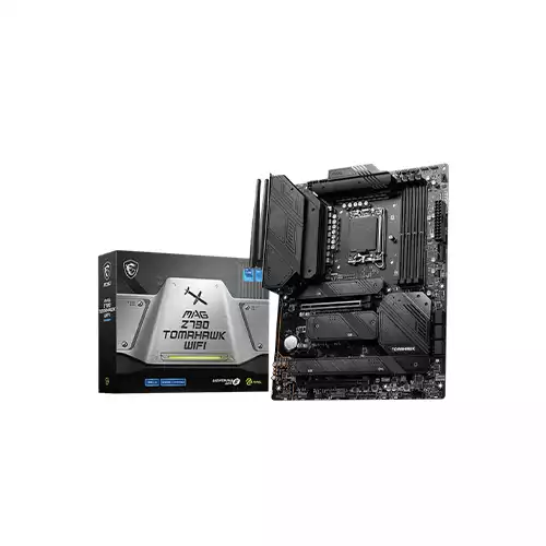 The MSI MAG Z790 TOMAHAWK WIFI motherboard is designed to support 12th and 13th Gen Intel® Core™ processors, Pentium® Gold, and Celeron® processors. The board features the Intel Z790 chipset and can accommodate up to 192GB of DDR5 memory across four slots with a memory speed of 7200+(OC)/ 7000(OC)/ 6800(OC)/ 6600(OC)/ 6400(OC)/ 6200(OC)/ 6000(OC)/ 5800(OC)/ 5600(JEDEC)/ 5400(JEDEC)/ 5200(JEDEC)/ 5000(JEDEC)/ 4800(JEDEC) MHz. The motherboard has onboard graphics, with an HDMI™ port supporting HDR and a maximum resolution of 4K 60Hz, and a DisplayPort supporting a maximum resolution of 8K 60Hz.The MSI MAG Z790 TOMAHAWK WIFI motherboard features two PCIe x16 slots, one PCIe x1 slot, and four M.2 slots (one sourced from CPU and three sourced from Chipset). Additionally, the board includes seven SATA 6G ports and supports RAID 0, RAID 1, RAID 5, and RAID 10 for both SATA storage devices and M.2 NVMe storage devices.The board comes with multiple USB ports, including four USB 2.0 ports at the front, four USB 3.2 Gen1 Type-A ports at the rear, two USB 3.2 Gen1 Type-A ports at the front, four USB 3.2 Gen2 Type-A ports at the rear, one USB 3.2 Gen2 Type-C port at the rear, one USB 3.2 Gen2 Type-C port at the front, and one USB 3.2 Gen2x2 Type-C port at the rear. The MSI MAG Z790 TOMAHAWK WIFI motherboard includes a 2.5Gbps LAN port and an Intel® Wi-Fi 6E wireless module that supports MU-MIMO TX/RX and 802.11 a/b/g/n/ac/ax.The motherboard also includes a Realtek® ALC4080 Codec for 7.1-channel USB high-performance audio, supports S/PDIF output, and has an internal I/O that includes power connectors, fan connectors, front panel connectors, a chassis intrusion connector, a front audio connector, a TBT connector, an RGB LED connector, and a TPM pin header. The motherboard also features four EZ Debug LEDs and multiple LED features.