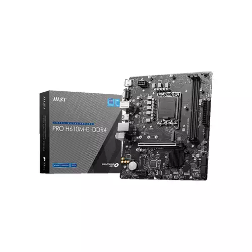 MSI PRO H610M-E DDR4 12th/13th Gen Motherboard. The MSI motherboard features support for 12th/ 13th Gen Intel® Core™ Processors, Pentium® Gold, and Celeron® Processors, with a processor socket LGA1700. It includes the Intel® H610 Chipset and 2x DDR4 memory slots, supporting up to 64GB of memory. The motherboard features a PCIe x16 slot (From CPU), supporting up to PCIe 4.0 x16, and a PCIe x1 slot (From H610 chipset), supporting PCIe 3.0 x1. Onboard graphics include 1x HDMI™ 1.4 with HDR port, supporting a maximum resolution of 4K 30Hz and 1x VGA port, supporting a maximum resolution of 2048x1536 50Hz, 2048x1280 60Hz, 1920x1200 60Hz. It has 4x SATA 6Gb/s ports (From H610 chipset) and 1x M.2 slot (Key M) (from CPU), supporting up to PCIe 3.0 x4 and 2242/ 2260/ 2280 storage devices. The motherboard features Realtek® ALC897 Codec and 7.1-Channel High Definition Audio, and a Realtek® RTL8111H 1Gbps LAN controller.