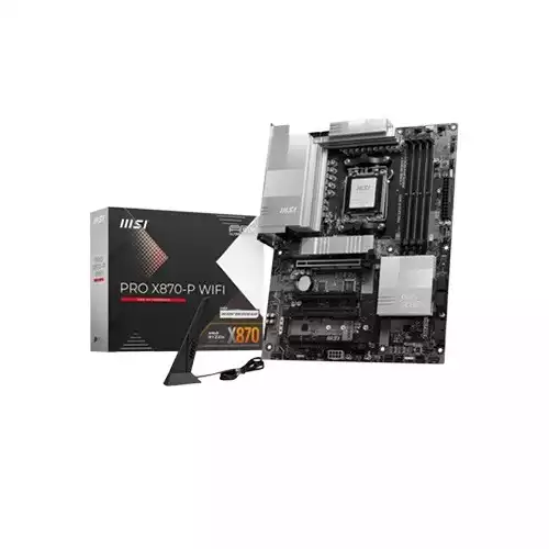 The MSI Pro X870-P Wifi is built on the AMD X870 chipset, supporting the latest Ryzen 9000/8000/7000 Series processors on the AM5 socket. It offers 4 DIMM slots for DDR5 memory, with a maximum capacity of 256GB and support for extreme memory speeds of up to 8200+ MHz through overclocking. The motherboard comes with four M.2 slots, two of which support PCIe 5.0, providing ultra-fast storage capabilities. Additionally, it supports various RAID configurations for both SATA and M.2 NVMe storage devices. Connectivity is a highlight, with multiple USB ports, including USB 40Gbps Type-C, Thunderbolt 5 support, HDMI 2.1, DisplayPort, and 5G LAN, ensuring fast data transfer and versatile connectivity for high-end devices.