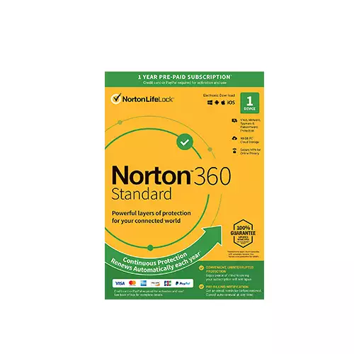 Norton 360 Standard gives you comprehensive malware protection for one PC, Mac, Android, or iOS device, including 10GB of secure PC cloud backup and Secure VPN for your device. Enrolling in our auto-renewing subscription and storing a payment method is required for activation and use. we cannot charge you until your renewal period. you'll get an email reminder before we charge your payment method and may cancel your automatic renewal at any time in your Norton account. Also included are additional features like Password Manager, SafeCam that alerts you and blocks unauthorized ss to your PC’s webcam, and Dark Web Monitoring powered by LifeLock.