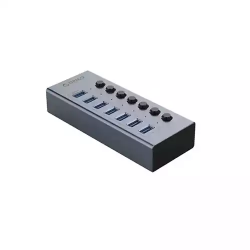 The ORICO BT2U3‑7AB 7‑Port USB3.0 Hub with Individual Switches is an efficient and versatile solution for expanding the number of USB ports on your computer or laptop. Featuring seven USB‑A 3.0 ports with high-speed data transfer up to 5 Gbps, it allows you to connect multiple peripherals such as external hard drives, flash drives, keyboards, mice, and printers without compromising performance. Each port comes with its own individual on/off switch and LED indicator, giving you full control over power usage, reducing clutter, and potentially extending the lifespan of connected devices. The hub is powered by an external 12 V/2 A (24 W) adapter and utilizes a VL817 control chip to ensure reliable performance even when multiple devices are in use. Its compact and durable design, crafted from a combination of aluminum alloy and ABS plastic, makes it sturdy yet lightweight enough to fit neatly on any desk or workstation. Plug-and-play ready, the BT2U3‑7AB works with Windows, macOS, and Linux, and includes a 1 m Type‑A to Type‑B connection cable along with blue LED indicators for clear feedback on power and activity. Overall, this ORICO hub is an ideal accessory for anyone seeking expanded USB connectivity with enhanced control and dependable performance.