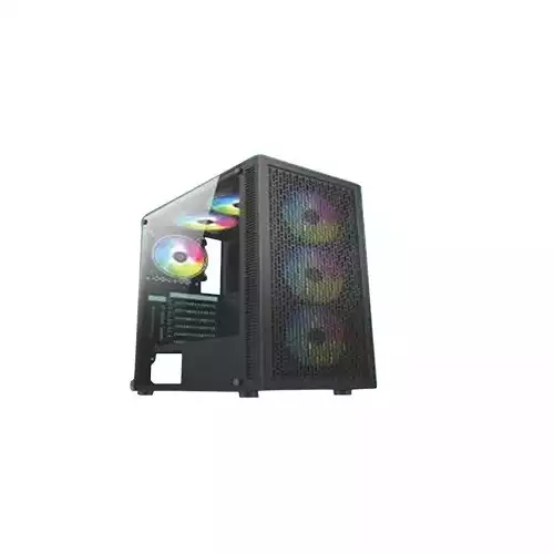 The PC Power PP-GS2406 Dark Flow Mesh Elite is a stylish mid-tower ATX gaming case designed for gamers who value both performance and aesthetics. This Black case supports ATX, Micro-ATX, and ITX motherboards, providing flexibility for various builds. It features a tempered glass panel, allowing you to showcase your internal components. The case is constructed from high-quality SPCC material, ensuring durability. With dimensions of 340 x 210 x 435mm, it offers a spacious interior that supports robust cooling options, including one 120mm Master fan and three 120mm Slaver fans. The case comes with four pre-installed 120mm ARGB fans, adding vibrant lighting to your setup. The I/O ports include one USB 3.0, one USB 1.0, and HD audio support, catering to your connectivity needs.