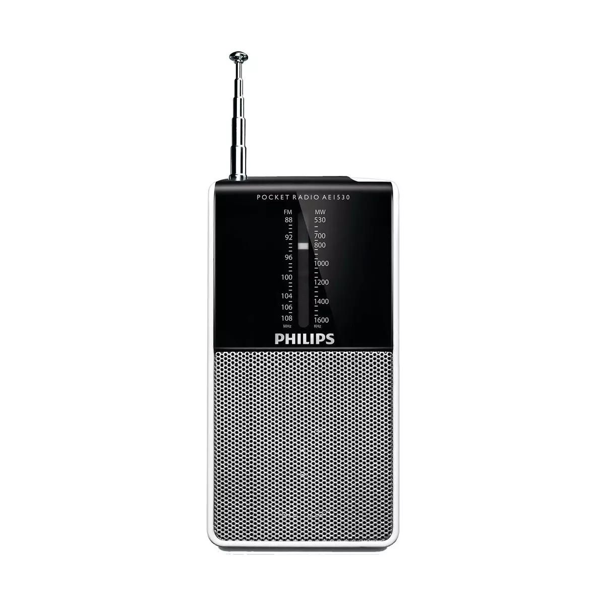 Brand - Philips, Model - Philips AE1530, Type - Portable Radio, Tuner Type - FM/MW, Analogue, Wave Support - MW, Features - FM/MW, Analogue tuning, Built-in speaker, Headphone jack, Battery operated, FM/MW (AM) stereo tuner, Speaker - Yes (Built-in), Power Output - 100mW RMS, Power Requirement - Battery, Battery Info - 2 x AAA (LR3) Battery, Dimensions - 56 x 117 x 19mm, Weight - 0.08Kg, Others - Sound system: mono, Volume control: rotary (analogue), Tuner bands: FM, MW, Audio/Video output: Headphone (3.5mm), Battery voltage: 1.5V, Specility - FM/MW tuner for radio enjoyment, Built-in speaker to enjoy radio out-loud in good sound, Stereo headphone jack for better personal music enjoyment, Pocket-size Philips MW/FM pocket radio, Warranty - 1 year