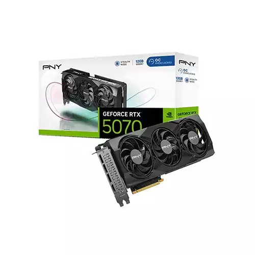 PNY GeForce RTX 5070 12GB GDDR7 OC Triple Fan Graphics Card, designed for gamers, creators, and professionals demanding power and efficiency. Powered by 6144 CUDA cores and built on the advanced Ada Lovelace architecture, this GPU delivers superior rendering, ray tracing, and AI-enhanced features. With a base clock of 2325 MHz and a boost clock up to 2587 MHz, it ensures lightning-fast processing speeds for even the most intensive applications. This graphics card features 12GB of ultra-fast GDDR7 memory on a 192-bit interface, offering a blazing 28 Gbps memory speed and up to 672 GB/s bandwidth—ideal for 4K gaming, real-time ray tracing, and high-resolution content creation. The triple-fan cooling system provides optimized thermal performance, maintaining stability during extended gaming sessions or heavy workloads. With support for DisplayPort 2.1b (x3) and HDMI 2.1b, the card enables multi-monitor setups and resolutions up to 4K at 480Hz or 8K at 165Hz with DSC 3.0. It draws power via a single 16-pin connector (adapter included for dual 8-pin), with a TDP of 250W, making it efficient for its performance class. The GPU fits into a 2.4-slot space and measures 11.80" x 4.73" x 1.9". Whether you're upgrading your gaming rig or building a powerful workstation, the PNY RTX 5070 brings stunning visuals and breakthrough performance in one sleek package.