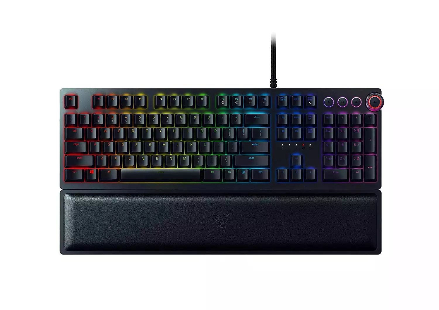 A magnetic wrist rest snaps to fit at the front of your keyboard. Made of plush leatherette for long-lasting comfort. Also features Razer Chroma-enabled underglow lighting for 20 customization zones.