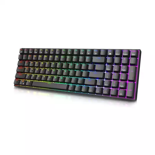 RK ROYAL KLUDGE RK100 is a full size, 3 modes connectable wireless mechanical keyboard with a 3750mAh battery, hot swappable Gateron switches, PBT& double-shot keycaps(high profile), anti-ghosting keys, ice blue backlits, HUB ports, independent arrow keys, a number pad, macro keys and a software. And it is compatible with windows/Mac OS/Android. Sleek and sophisticated, RK100 offers a focused, high-performance experience with features you need to take total control.
