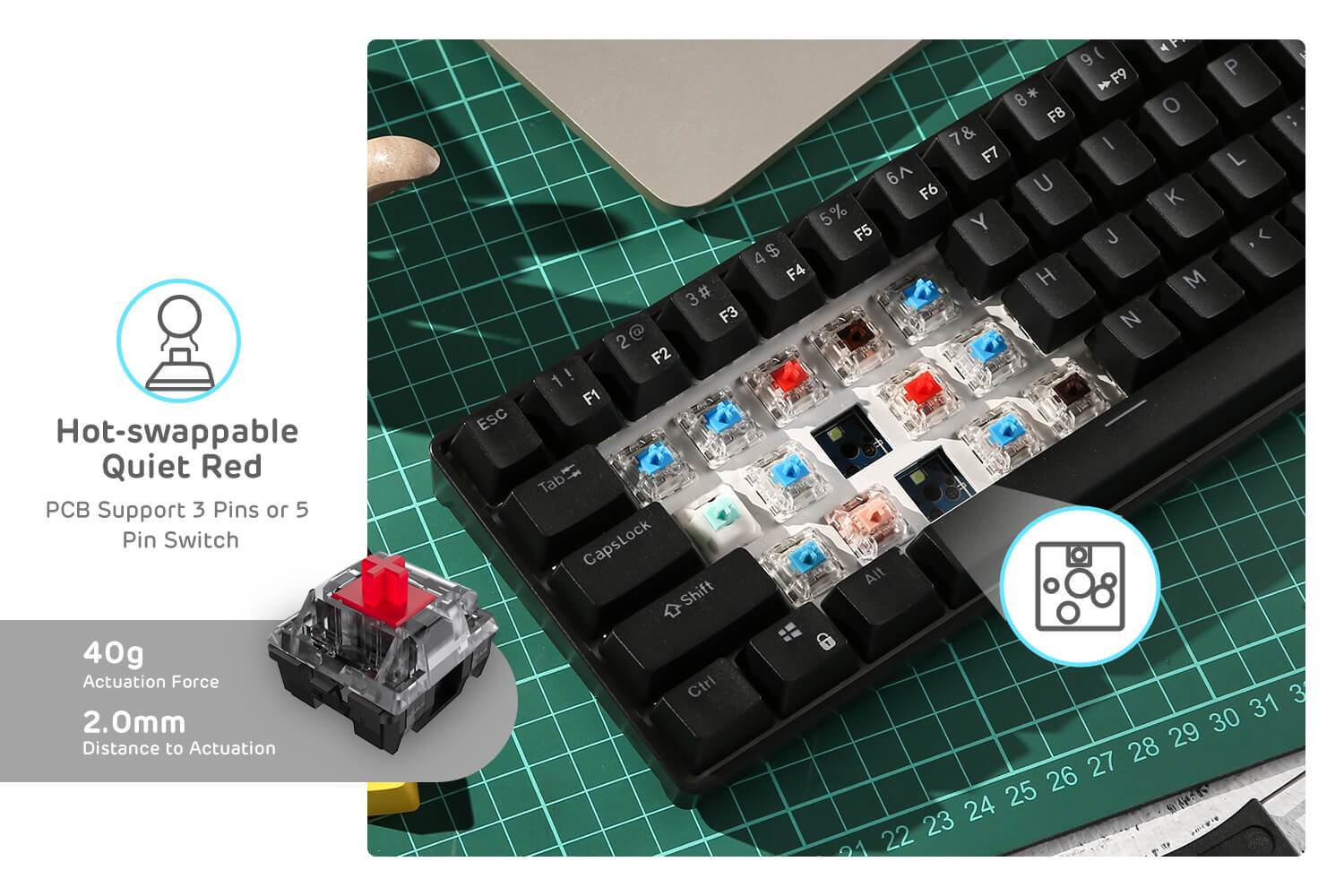 Hot-swap PCB allows you to replace 3 pins/5 pins switches freely without soldering issue. Enjoy the fun of making your own unique keyboard. Red switch features a quiet and linear typing experience. The soft, top-to-bottom feedback offers easier and smoother use than other tactile switches. Perfect for people who work in an open office and stay up gamers.