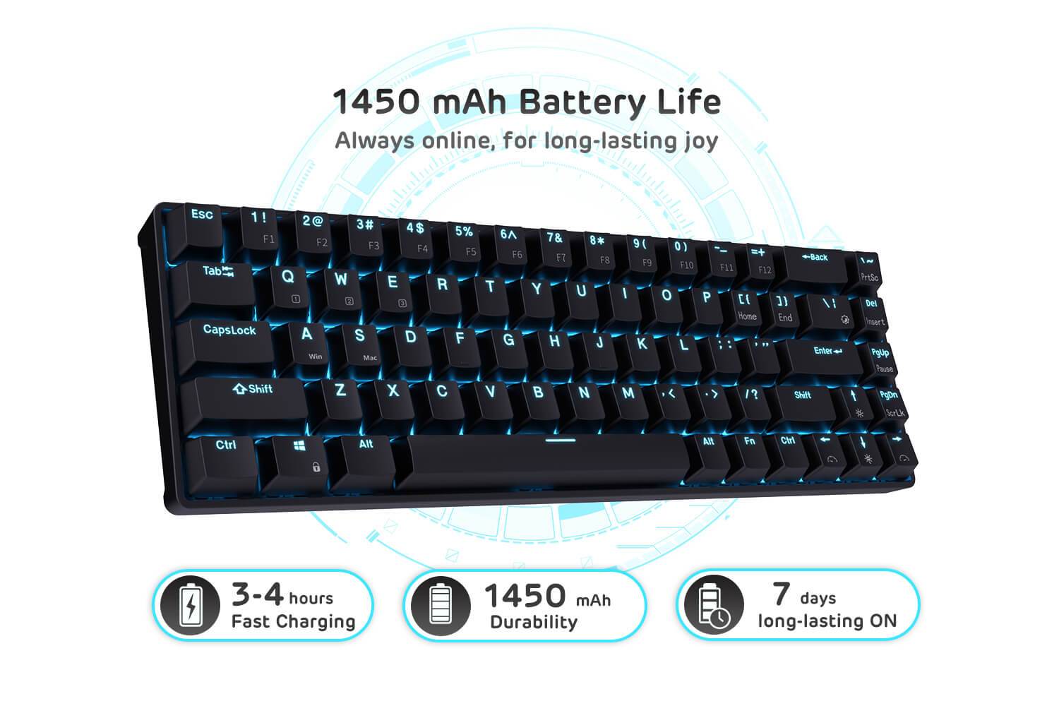 | Others | Easily 5 different devices switchable FN + Q/W/E/R/T in wireless mode Dual Modes with 6 Devices Hot-swappable Quiet Red 1450 mAh Battery Life DIY Software Supports 68 Keys Compact Bluetooth Gaming Keyboard Stand-Alone Arrow/Control Keys |