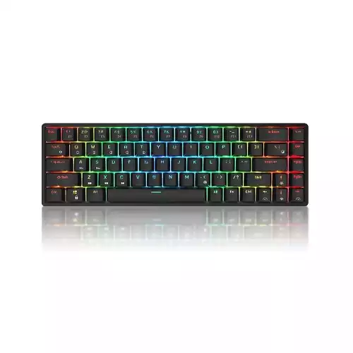 A 65% compact 68-key wireless mechanical keyboard with RGB backlit, classically opaque, high profile and PBT keycaps.This Mechanical keyboard includes 2.4GHz wireless, Type-C-USB 2.0 wired and Bluetooth 5.1 modes. Be equipped with a 2.4GHz dongle(adaptor); Connects with up to 3 devices via Bluetooth; N-key rollover in the wired mode.This hot swappable keyboard can be hot swapped at wish and replaced by all of MX-similar mechanical switches freely, supporting hot swap of 3-pin/5-pin switches. Available in Gateron blue/brown/red switch.Geared with 2 built-in USB pass-through ports and 1 Type-C port, this 65% keyboard is allowed to back up more facilities. And RK ROYAL KLUDGE RK G68 is armed with a 3150mAh battery, lasting up to 48 hours.