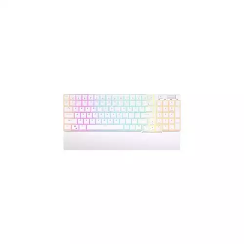The Royal Kludge RK96 Tri Mode RGB Hot Swap Mechanical Gaming Keyboard, available at TechLand BD, is a top-tier gaming keyboard designed for the discerning gamer. This ergonomic keyboard is equipped with 96 keys, including a blue switch type, offering a tactile and clicky feedback beloved by typists and gamers alike. The keyboard supports English language input but does not support Bangla. It boasts a triple connection mode - Bluetooth, USB, and USB Dongle, providing versatility and convenience for all your gaming needs. The keyboard also features RGB lighting, adding an aesthetic appeal to your gaming setup. It does not have a fingerprint sensor, maintaining a sleek and uninterrupted design. The keyboard is a standalone package and does not come with any other peripherals. It has a working or Bluetooth range of 10 meters, allowing for comfortable distance gaming. The keyboard comes with a rechargeable battery included, eliminating the need for constant battery replacements. It supports multiple operating systems including Windows, Mac, and Linux, making it a versatile choice for various users. The keyboard measures 375.92 x 124.46 x 38.1mm and weighs 1.4 kg, making it compact and portable. It also includes a 0.14-meter cable for wired connections. The keyboard is white in color, adding a clean and modern look to your gaming setup. It comes with a 1-year warranty, ensuring peace of mind with your purchase from TechLand BD. The keyboard’s specialty lies in its Huano switches and its ability to redefine full-size keyboards with its 96 keys. It also features a 3750mAh battery, hotswap, 2 built-in USB pass-through ports, and 1 Type-C Port. The keyboard also doubles as a 2 USB HUB, and is a wireless Bluetooth/2.4Ghz 80% RGB Mechanical Gaming Keyboard.| Keyboard | |