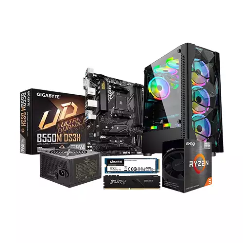 The AMD Ryzen 5 5600G Gigabyte B550M DS3H 8GB RAM 250GB SSD Budget PC is a powerful and affordable computer designed for various tasks. It features an AMD Ryzen 5 5600G processor with 6 cores and 12 threads, providing excellent performance. The processor also integrates Radeon graphics, eliminating the need for a separate GPU. The motherboard is a GIGABYTE B550M DS3H AMD model, offering stability and expandability options. The system comes with 8GB of Kingston Fury Beast DDR4 RAM, operating at 3200MHz for smooth multitasking. A 250GB Kingston NV1 NVMe PCIe Gen 3.0 X 4 SSD provides fast storage and quick boot times. The power supply is a GAMDIAS AURA GP550 550W unit, ensuring sufficient power delivery. The PC is housed in an OVO E335D Mid Tower Gaming RGB case, which adds style to the system but does not have a warranty. Individual components come with different warranty periods ranging from 3 years to a lifetime, depending on the product. Overall, this budget PC offers a solid configuration with reliable components and a balanced mix of performance and affordability. Bangladesh's top retailer of computer hardware and applications is Techland BD. A hallmark of Techland BD is its top-notch client support. They have a helpful and knowledgeable crew that is always willing to help customers. The large selection of Desktop PC available at Techland BD is well recognized. The large selection of Budget PC available at Techland BD is well recognized.