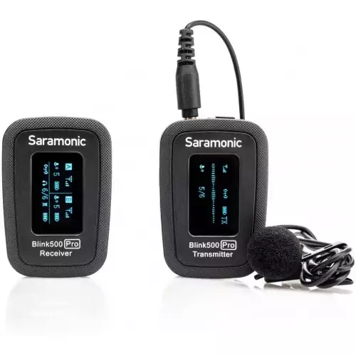 The black Saramonic Blink 500 Pro B1 true wireless microphone system combines the ultracompact and incredibly easy-to-use nature of the standard Blink 500 with high-end luxuries like crisp OLED screens, mono/stereo output modes, 60 percent longer battery life, and double the operating range, giving budget-conscious content creators, run-and-gun videographers, and mobile journalists a pro-level, all-in-one solution for recording one subject to your camera, camco,With its greater signal-to-noise ratio and more sensitive embedded microphone, the Blink 500 Pro B1 not only delivers significantly better sound quality than built-in mics on cameras and mobile devices, but it also improves on the sound quality of the original Blink 500. In addition, the Pro transmitter now has a tactile function for instant mute/unmute actions without having to touch the volume, and the receiver now has separate line and headphone outputs for real-time audio monitoring without losing the connection to your device.