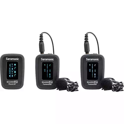 The black Saramonic Blink 500 Pro B2 true wireless microphone system combines the ultracompact, extraordinary, and easy-to-use nature of the standard Blink 500 with high-end luxuries like crisp OLED screens, mono/stereo output modes, 60 percent longer battery life, and double the operating range, giving budget-conscious content creators, run-and-gun videographers, and mobile journalists a pro-level, all-inclusive solution for recording two subjects to your camera, camc,The Blink 500 Pro B2 not only delivers far better sound quality than built-in mics on cameras and mobile devices, but it also improves on the original Blink 500's sound quality with a greater signal-to-noise ratio and more sensitive integrated microphone. The Pro transmitter now has a tactile mute/unmute option that may be used without touching the volume. In addition, the receiver has separate line and headphone outputs, allowing for real-time audio monitoring without interrupting your recording.