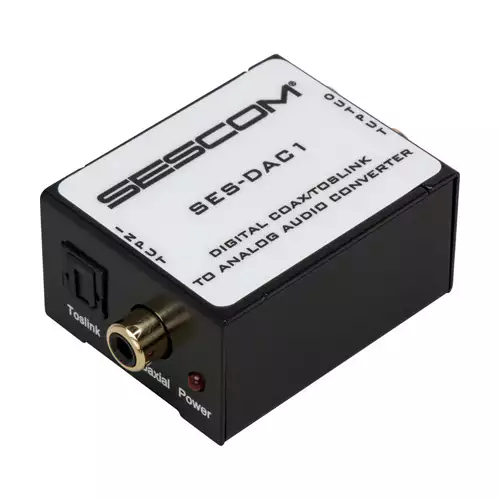 Convert your computer's audio to glorious analog sound with the SES-DAC1 from Sescom, a digital-to-analog audio converter designed to give consumers pleasurable sonics. The SES-DAC1 offers digital connections through either optical TOSLINK or coaxial S/PDIF jacks. Simply plug into your jack of choice to make the desired connection. On the output side, you'll find two RCA jacks for routing sound to analog equipment, such as stereo receivers and consumer-grade amplifiers. The SES-DAC1 offers 24-bit conversion for broadcast-quality dynamic range when converting an uncompressed LCPM signal to analog sound. A power adapter is included.
