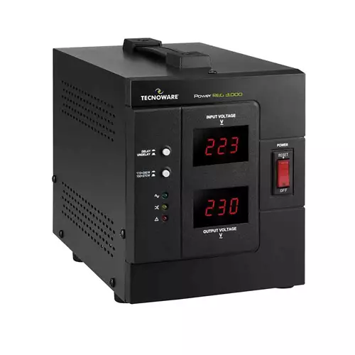 Single-phase power reg electronic voltage stabilizer for households, peripherals and telecommunication systems High stabilization speed and high efficiency Stabilization without micro interruptions Power 3000VA 1 schuko / italy outputs and 1 IEC output