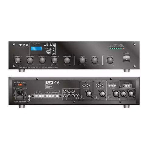 Total Harmonic Distortion < = 1 % @ 1 KHz, Frequency Response 50 HZ ~ 15 KHz ± 3dB, Output 100V, 70V, 8Ω, Signal to Noise Ratio 86 dB, Phantom Power Adjustable Mic 1 ~ 5 (Default Off), Mounting Free Standing or 19” Rack.Power Supply AC 115/230V 50/60Hz, DC 24V, Power Output 60W RMS, Total Harmonic Distortion < = 1 % @ 1 KHz, Frequency Response 50 HZ ~ 15 KHz ± 3dB, Output 100V, 70V, 8Ω, Signal to Noise Ratio 86 dB, Phantom Power Adjustable Mic 1 ~ 5 (Default Off), Mounting Free Standing or 19” Rack.TEV TPA-6120U. TEV TPA-6120U PA Amplifier (120W). Power Output: 120W RMS, Frequency Response: 50 HZ ~ 15 KHz ± 3dB, Dimension: 88×425×305 mm (H.W.D), Power Supply AC 115/230V 50/60Hz, DC 24V, Power Output 60W RMS, Total Harmonic Distortion < = 1 % @ 1 KHz, Frequency Response 50 HZ ~ 15 KHz ± 3dB, Output 100V, 70V, 8Ω, Signal to Noise Ratio 86 dB, Phantom Power Adjustable Mic 1 ~ 5 (Default Off), Mounting Free Standing or 19” Rack.