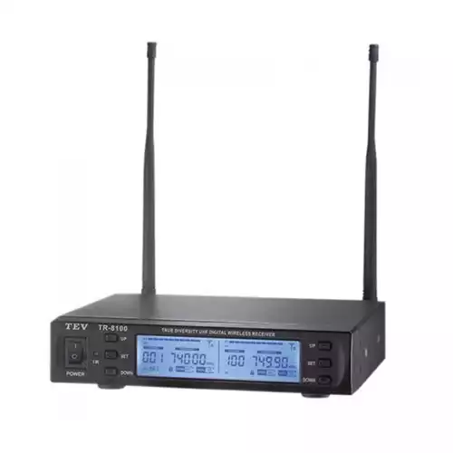 • Consume Power 5 WATT • S/N Ratio >107dB • Receiving Sensitivity 5dBuv • Antenna Power Output 9V / 100mA Receiver Dimension 208 x 180 x 44mm • Receiver Weight 1 kg • Transmit Power 30mW (Max) • Modulation Mode FM • Max Deviation +25KHz • Battery Voltage 3V (2x1.5V AA Battery) • Continuous Using 5-8 hour.• Dynamic Range >90dB • T.H.D <0.5% • Frequency Response 40Hz-15000Hz -3dB • Audio Output Balance (XLR)/ On balance (6.3@jack) • Receiver Mode Dual Channel, True-Diversity • Power Supply DC12V-15V / 1A .TEV TR-8100TD UHF 100CH DIGITAL TRUE DIVERSITY WIRELESS MICROPHONE SYSTEM • Frequency Range Digital UHF PLL 100CH (510-950MHz) • Frequency range depends on the regulations. Oscillator PLL Synthesized, Preset 100 selectable channels • Frequency Bandwidth 30MHz • Frequency Stabilization +50KHz.
