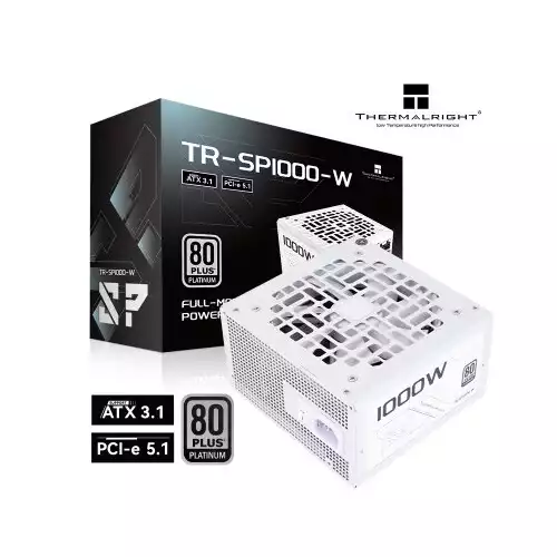 The Thermalright TR-SP1000-W 1000W 80 Plus Platinum Full-Modular Power Supply is a powerhouse engineered for high-performance gaming rigs, professional workstations, and overclocked systems that demand stable, efficient, and reliable power delivery. With a robust 1000W output capacity, it provides ample power for modern high-end GPUs, multi-core processors, and complex system configurations. Built to the latest ATX 3.1 standard and featuring PCI-E 5.1 compatibility, this PSU is fully prepared to support next-generation graphics cards and hardware, ensuring future-proof performance. Its 80 Plus Platinum certification guarantees superior power efficiency, reducing energy waste, lowering heat output, and improving overall system reliability while also helping minimize electricity costs. The full modular design allows for a clutter-free setup by letting you connect only the necessary cables, which improves airflow and aesthetics, particularly in cases with tempered glass panels. With a stylish white finish, the TR-SP1000-W not only powers your system but also complements modern white-themed or custom PC builds. For added protection, the PSU integrates multiple advanced safety features including OPP, OVP, OTP, OCP, SCP, and UVP, safeguarding your system from potential electrical risks. Its dual 12V rail (2x6) design ensures rock-solid stability, even under heavy loads. Thermalright has reinforced the PSU with high-quality components to provide long-lasting performance, and it comes backed by a 5-year warranty, giving you peace of mind and confidence in your investment. Whether you are a gamer pushing frame rates to the max, a content creator running demanding applications, or a professional relying on system stability, this PSU ensures your PC operates at its peak.