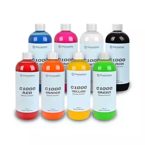 The latest C1000 Opaque Coolant launched by Thermaltake is used as anti-corrosion protection fluid and heat-transfer medium for PC water-cooling. Made in Germany, the C1000 Opaque coolant is virtually odorless, non-flammable, and high performance liquid, offering superb protection for copper, nickel, brass, and aluminum. Choose from seven vivid colors: red, green, blue, orange, yellow, white, and purple to brighten up any build with Thermaltake.