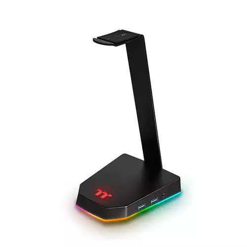 Thermaltake E1 RGB Gaming Headset Stand featuring a 2-port USB 3.0 hub and three .5mm 4-pole audio port allowing users to attach on to the headset represent maximum convenience and cable management ease.
