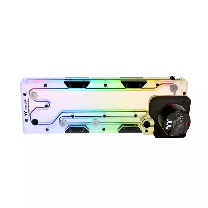 The Pacific DP100-D5 Plus RGB liquid cooling Distribution plate and D5 pump combo that simplifies the tube structure of hard tubing water cooling and adds a smarter way for beginners and experienced modders to present their water-cooled builds..Pacific DP100-D5 Plus. The Thermaltake Pacific DP100-D5 Plus is a distribution plate with a pre-installed D5 pump, the distro is universal and can be fitted to most 360mm radiator fan mounting points. Furthermore can be synced with our TT RGB PLUS Ecosystem. Full RGB Illumination Design The built-in 18 addressable LEDs feature great light coverage. The lighting is compatible with TT RGB PLUS and ASUS, GIGABYTE, MSI, and ASROCK RGB software.