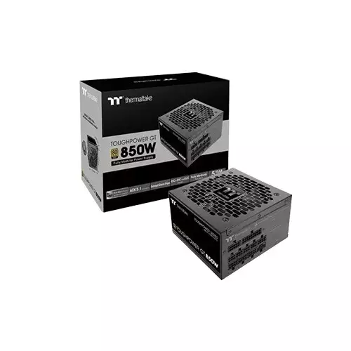 The Thermaltake ToughPower GT 850W power supply by Thermaltake delivers dependable performance for high-end gaming PCs, workstations, and creative setups. With 80 Plus Gold certification, it ensures efficient energy use while supporting powerful CPUs and GPUs. Its fully modular cabling simplifies installation and keeps builds clean, while a 120mm hydraulic bearing fan maintains quiet cooling even under heavy loads.